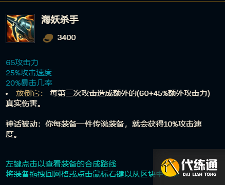 海妖杀手:海妖杀手也成为了某些近战战士的对线利器,因为战士英雄普遍依赖于技能组与平a之间的相互串插,再加上有些战士本身附带的额外攻击效果,使得海妖反而成了更加适合的装备,适合这一类装备的英雄主要是一些以来普攻特效的ad型战士,例如破败之王,螃蟹,剑圣等。