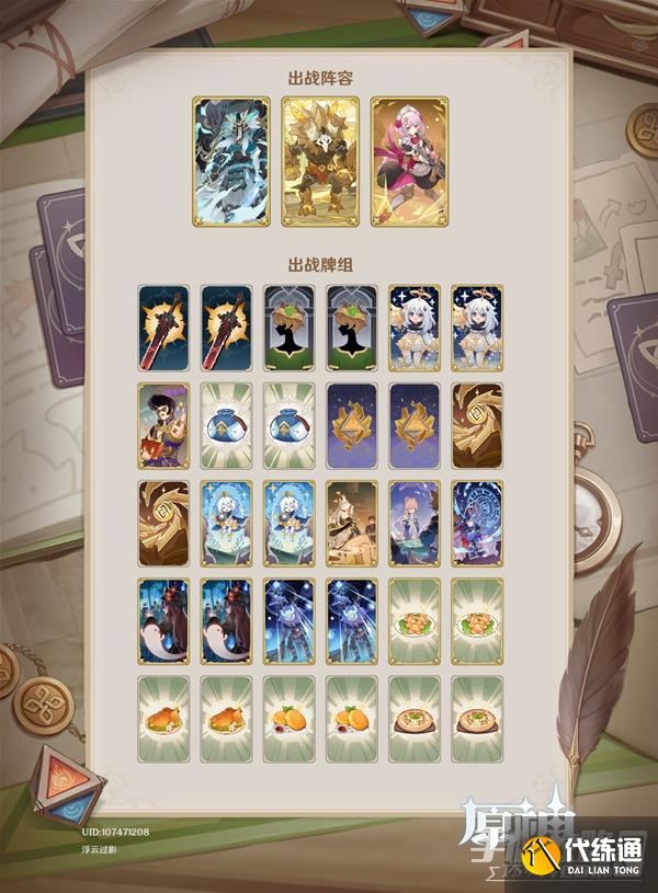 这套牌主旨就是剑鬼不那么重要了,能开出冰风两分身就不亏,要是能开出大招就是血赚。只要剑鬼能打出扩散给对面挂上冰,我们再上岩丘丘王技能撞残对方(丘丘王有被动时伤害很高,一个元素战技就是5伤+1点结晶盾),基本再怎么样对面也残了,接下来就可以换女仆提起狼末开始收割了。