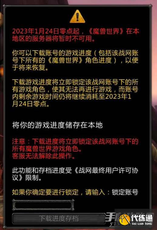 1、1月18日期玩家登录游戏可以使用数据封存系统,如下图所示,玩家可以通过该功能将游戏进度储存在本地,进度下载完成后玩家账号下对应的角色也将无法登录游戏。