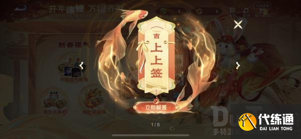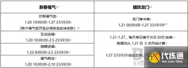 1、开年锦鲤万福齐聚,1.21日除夕首场对局得福气签,解签必得自选史诗皮肤自选宝箱(10选1或皮肤碎片*10),限当日可得;