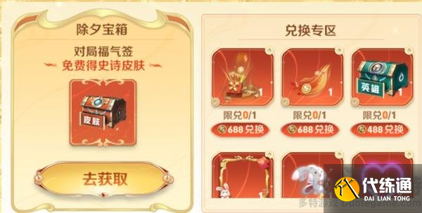 4、福气商店可兑换全新春节主题招财进宝回城、招财进宝拖尾、钱兔无量头像框、兔兔冲冲个性戳戳、自选英雄等好礼,除夕福气签中未领取的自选皮肤宝箱也可在此领取;