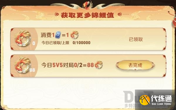 开放期间每天完成2场对局可获得88锦鲤值,每日1次。对局模式包括排位、5V5匹配、人机、娱乐模式、巅峰赛、赏金赛、战队赛、微赛事、全民电竞。请当日在活动内手动领取;
