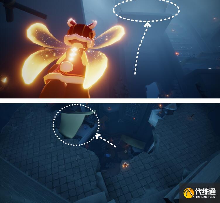 1、首先进入到追忆季新地图,接着向左边飞去来到一个有帐篷的高楼平台上面。