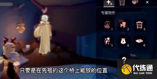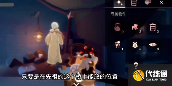 2.这个先祖缓解悲伤的专属物品是茶壶,我们先飞上来,这个茶壶的位置需要放在先祖的旁边,只要是在先祖的这个桥上能放的位置都是可以成功的,点击确定然后保存就可以完成第四个季节任务,
