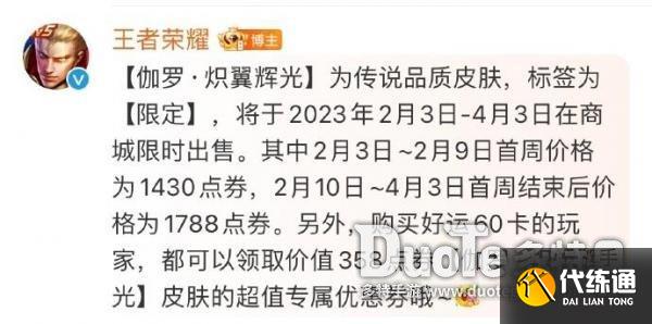 【伽罗·炽翼辉光】皮肤将于2023年2月3日0点与大家见面,拥有好运60卡的玩家可享皮肤超值优惠哦~
