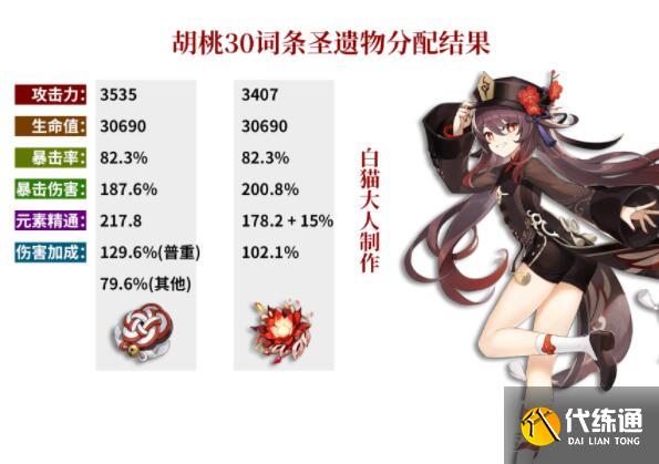 胡桃的模板为90级0命带1精90级护摩之杖,技能全都为Lv.9。因为胡桃吃的属性比较多,百分比攻击力、百分比生命值、暴击率、暴击伤害、元素精通,所以针对胡桃自身的模板进行30词条的属性随机分配求最大值,这是分配后的结果。