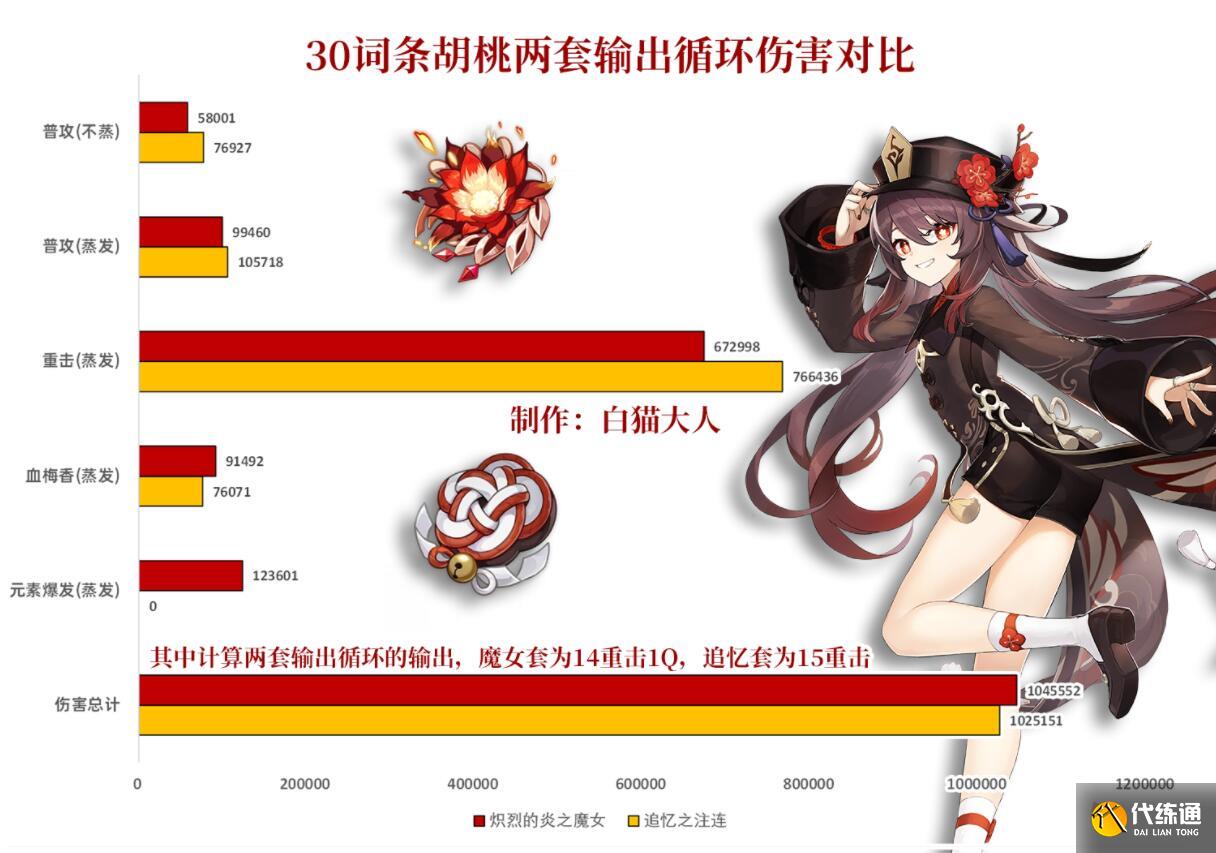 普重的意思是普攻重击。接下来针对具体机制我做一些比较细致的讲解。胡桃的A重循环中,平A是存在附着CD的,为100形式,重击则无附着CD,可以连续蒸发。因为魔女套也不能保证每次输出循环中都有元素爆发,所以我们计算的是两轮输出循环打一个元素爆发,追忆套则不打元素爆发,但是会在这段时间内多打一个重击。关于连续重击的次数,我们一轮循环取比较保守的7次来计算,也就是魔女套两套循环是14次A重+1次元素爆发,追忆套则是15次A重。因为上述平A有附着CD的影响,14次A重中,第1 4 7次可以反应,2 3 5 6次不行。至于血梅香和元素爆发,我们则默认都可以吃到蒸发。在此基础上我们进行数值伤害模拟,默认配置为胡行钟。