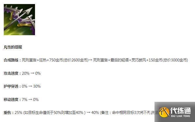 合成路线:死刑宣告+狂热+750金币(总价2600金币)→ 死刑宣告+最后的轻语+灵巧披风+150金币(总价3000金币)