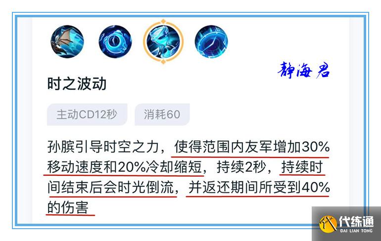 孙膑的二技能不但可以给技能范围内的队友提供较高的移速和冷却缩减属性,还能在技能结束后返还期间受到的40%伤害。