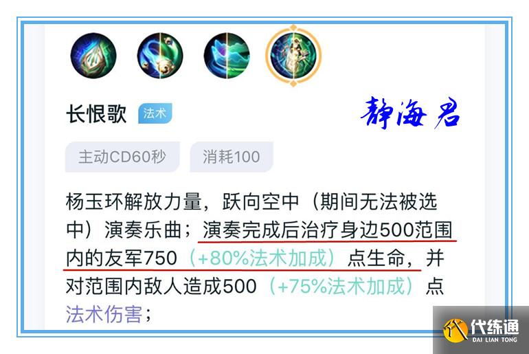 除了被动有一定的治疗效果以外,杨玉环的大招同样能给技能范围内的队友提供很好的回复效果。