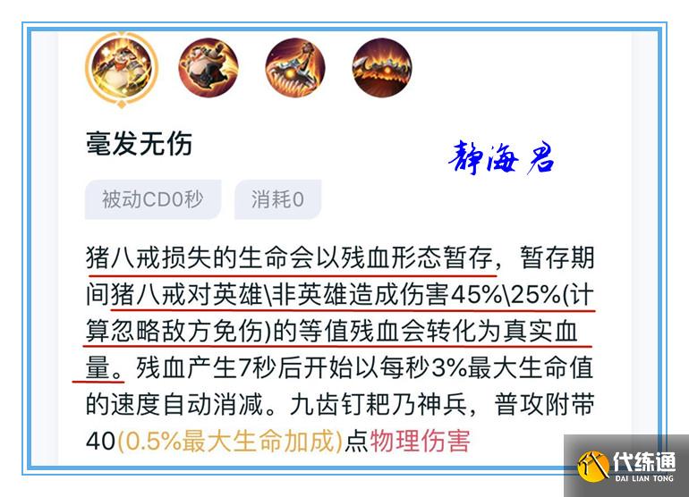 大家都知道猪八戒损失的生命值会以残血的形态出现,而在残血状态的情况下,猪八戒在对英雄/小兵/野怪造成的伤害时,就可以将残血以一定的比例转换为真实血量,并且这个转换的比例是忽略敌方减伤的。
