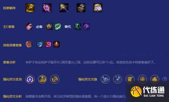 有铲子肯定抢铲子能开9三国尽量九三国,这样后期可以多个c位。其他优先找卡特装备就好了。