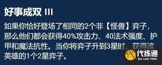 好事成双在上两枚相同棋子(非怪兽棋子)可直接增加棋子25/30/40%攻击力与法强,还能增加25/30/40的双抗,这样可直接让阵容输出与坦度强度均翻倍,关键是在棋子3星后还能直接给予个2星棋子,省下了更多的经济用来追其他棋子三星。