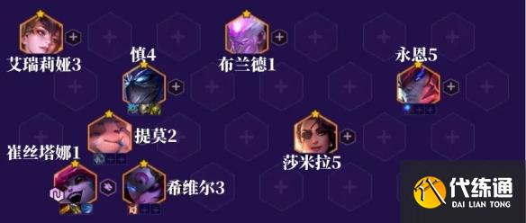 阵容组成:小炮(龙魂天选)、提莫、布兰德、希维尔、萨米拉、慎、刀妹、永恩