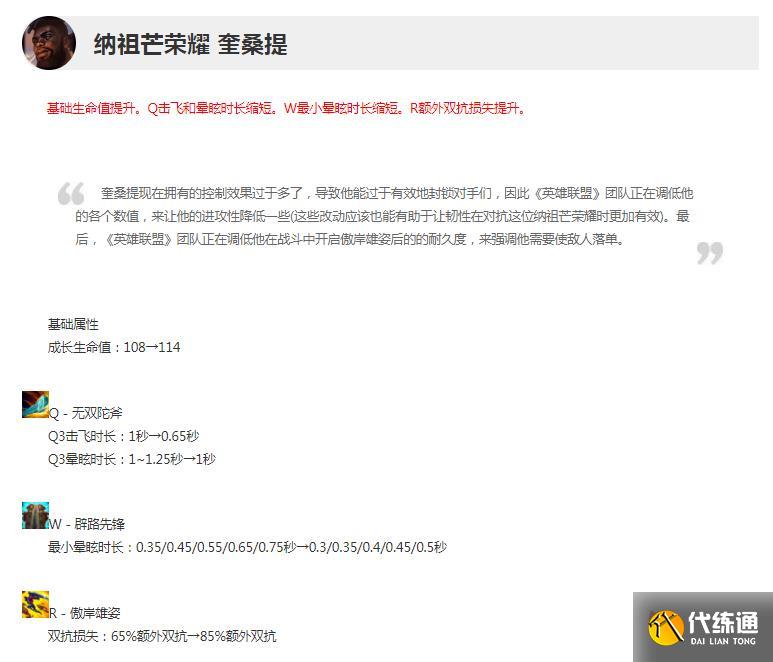 基础生命值提升。Q击飞和晕眩时长缩短。W最小晕眩时长缩短。R额外双抗损失提升。