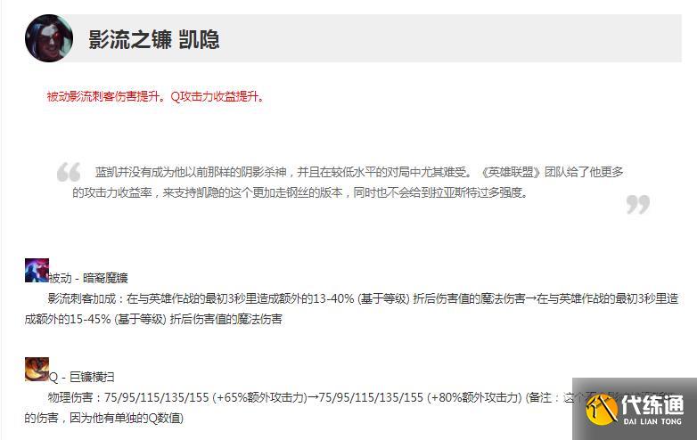 被动影流刺客伤害提升。Q攻击力收益提升。