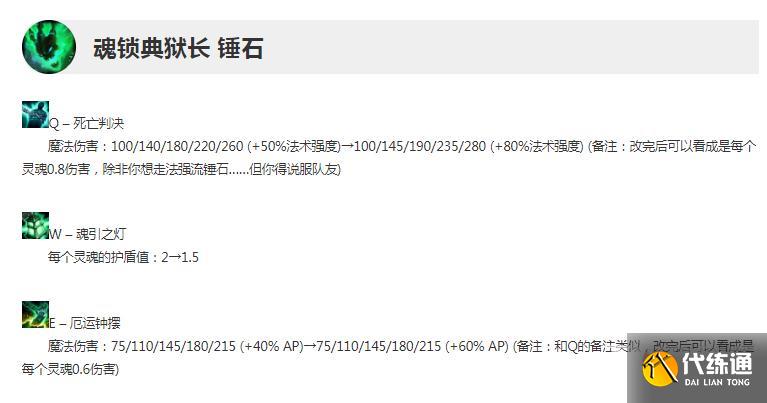 魔法伤害:100/140/180/220/260 (+50%法术强度)→100/145/190/235/280 (+80%法术强度) (备注:改完后可以看成是每个灵魂0.8伤害,除非你想走法强流锤石……但你得说服队友)