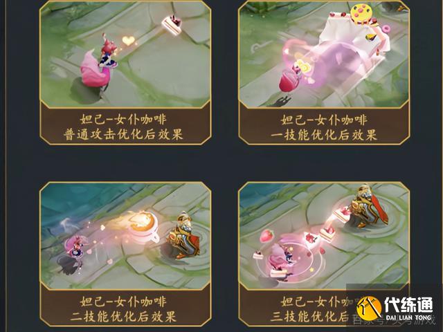 上一次优化是曝光的女仆咖啡的设计稿,这一次是局内的技能特效,我们也可以看到,这一次女仆咖啡从勇者升级到了史诗,整体的特效都围绕着咖啡屋中的甜点,一技能可以推出一张摆满甜点的桌子,犹如视觉盛宴,二技能竟然是一杯咖啡,上面还有制作的爱心拉花,另外三技能则是一个草莓奶油蛋糕,从这些具有创意的技能特效,明显感觉到这款史诗皮肤真的挺值,而且这款皮肤还可以使用皮肤碎片免费兑换。