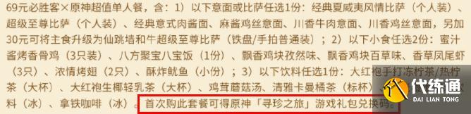 玩家首次购买任意套餐,均可获得《原神》游戏兑换码一份,多次购买不重复赠送。