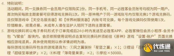 游戏兑换码将以电子券码形式于订单完成后24小时内发送至必胜客APP、必胜客微信会员小程序-会员卡包V聚会”版块内,会员依照使用说明点击复制兑换码并须前往《原神》游戏“设置-账户”页面兑换相应游戏道具,具体使用规则以券详情说明为准。