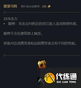 提亚马特可以提供25攻击力,并且攻击会对附近的其它敌人造成物理伤害,属于爆发型近战AD装备。它可以加快清线速度,非常适合单带型英雄。