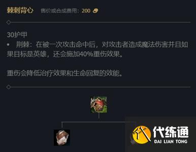棘刺背心可以提供30护甲,并且在被一次攻击命中后,对攻击者造成魔法伤害并且如果目标是英雄,还会施加重伤效果,前期对线回复能力强的英雄可以出。