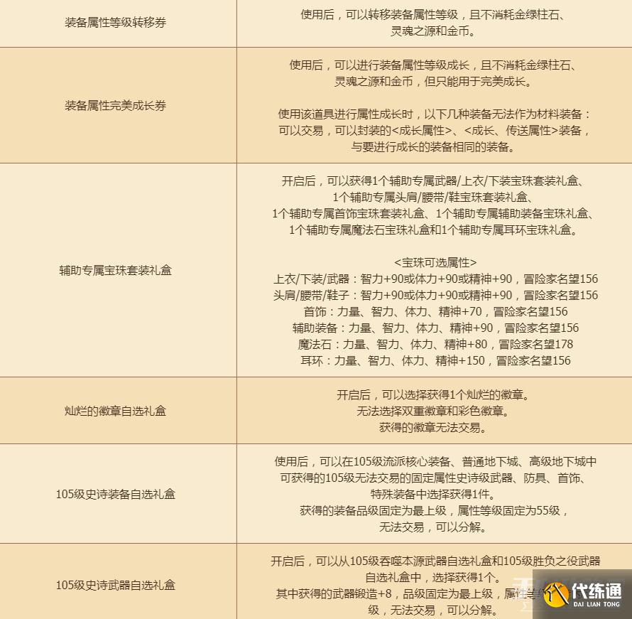 开启后,可以获得11个105级史诗装备自选礼盒、1个105级史诗武器自选礼盒、12张装备属性完美成长券、12张装备属性等级转移券、 1个辅助专属宝珠套装礼盒、5个一次性材质转换器和4个灿烂的徽章自选礼盒。