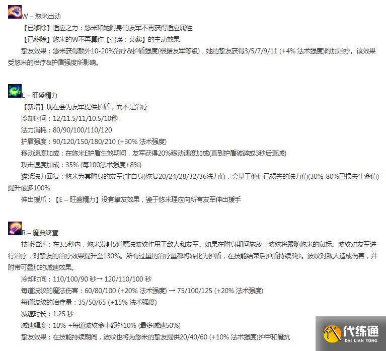 挚友效果:悠米获得额外10-20%治疗&护盾强度(根据友军等级),她的挚友获得3/5/7/9/11 (+4% 法术强度)附加治疗。该效果受悠米的治疗&护盾强度所影响。