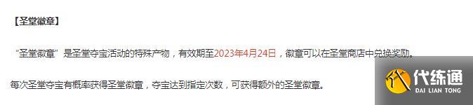 “圣堂徽章”是圣堂夺宝活动的特殊产物,有效期至2023年4月24日,徽章可以在圣堂商店中兑换奖励。