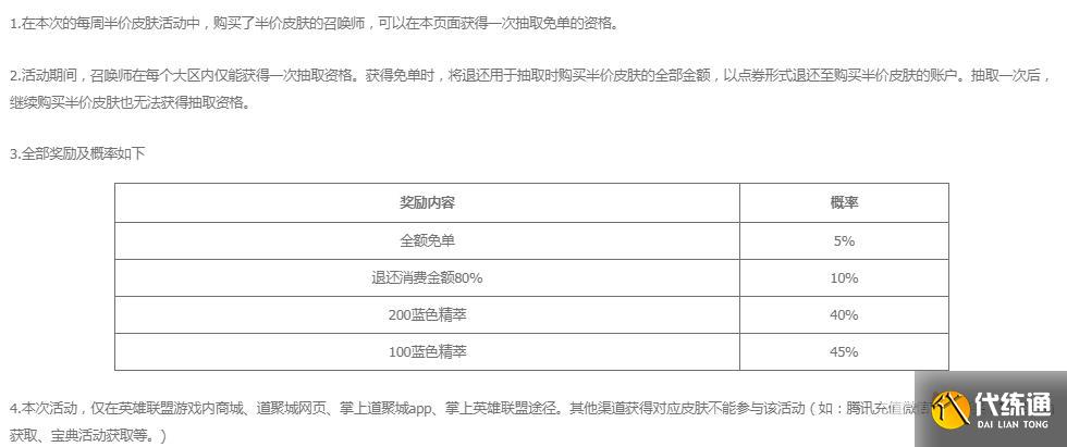 玩家仅在规定购买时间内购买当期的半价皮肤,可获取抽取资格。在本次的海周半价皮肤活动中,购买了半价皮肤的召唤师,可以在本页面获得一次抽取免单的资格。