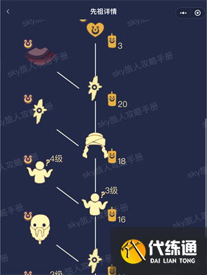 位置:进入雨林大厅后往右上方的云洞飞,打开光门穿过云洞就可以进入风行网道(需要已解锁一个禁阁先祖),进入风行网道,飞向位于中央岛屿左侧的台阶,可以在台阶上看到先祖。