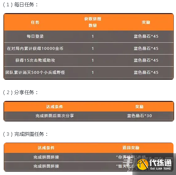 (1)完成每日任务可获得碎片以及蓝色晶石奖励。