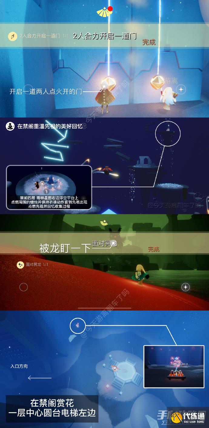 「在禁阁重温先祖的美好回忆」禁阁四层,雨林星图右边浮空平台上。需点燃蜡烛摆出祈祷动作直到中间石碑完全变白,然后重温出现的先祖的收集过程