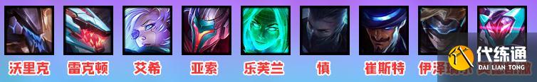 阵容:沃里克、雷克顿、艾希、亚索、乐芙兰、慎、崔斯特、伊泽瑞尔、莫德凯撒