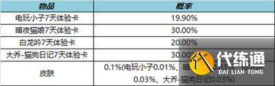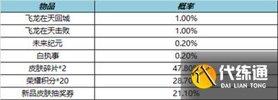 打开后必得皮肤碎片*2、铭文碎片*100和以下随机奖励之一:皮肤或皮肤体验卡(7日)1张(鲁班七号-电玩小子、阿轲-暗夜猫娘、韩信-白龙吟、大乔-猫狗日记)