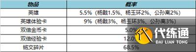 打开后可随机获得以下奖励之一:杨戬、杨玉环、公孙离、英雄体验卡3天、双倍金币卡:1日、双倍经验卡:1日、188/138/108铭文碎片。