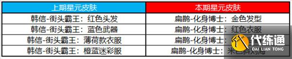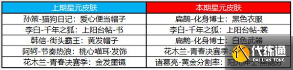 限免皮肤:孙尚香-末日机甲、刘备-时之恋人、赵云-淬星耀世、花木兰-冠军飞将、孙策-末日机甲、貂蝉-猫影幻舞、小乔-青蛇、公孙离-无限星赏官、刘禅-天才门将、张飞-乱世虎臣