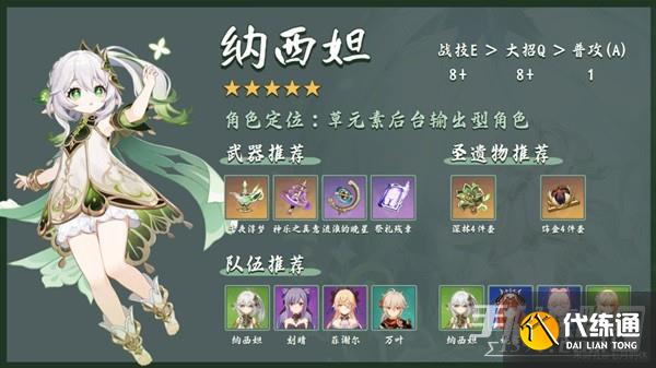 纳西妲是七神之一,元素为草元素,简称“草神”,是一个后台副c角色,具有非常优秀的后台输出能力和挂草能力,适配几乎所有草元素相关反应的队伍,且是多个队伍顶配选择,不管是泛用性还是强度,都是一个非常抽取的优秀角色!