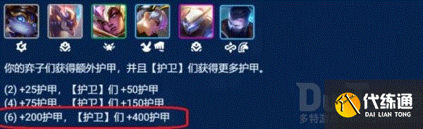 阵容的坦度极高:阵容是开了6护卫羁绊,慎的护甲470+(圣盾使的誓约还+20护甲),遇到物理输出阵容,敌方的攻击就像是挠痒痒,哪怕遇到高爆发法系阵容,圣盾使的誓约还能给慎增加护卫,扛过关键的输出伤害。