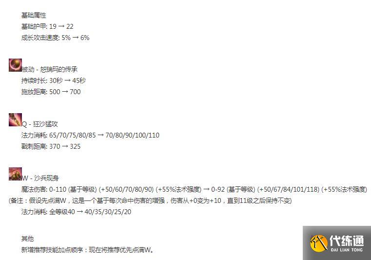 基础护甲提升,成长攻速提升。被动持续时间和施法距离提升。Q法力消耗提升,戳刺距离降低。W伤害提升,法力消耗现在随等级降低。新增推荐技能加点顺序。