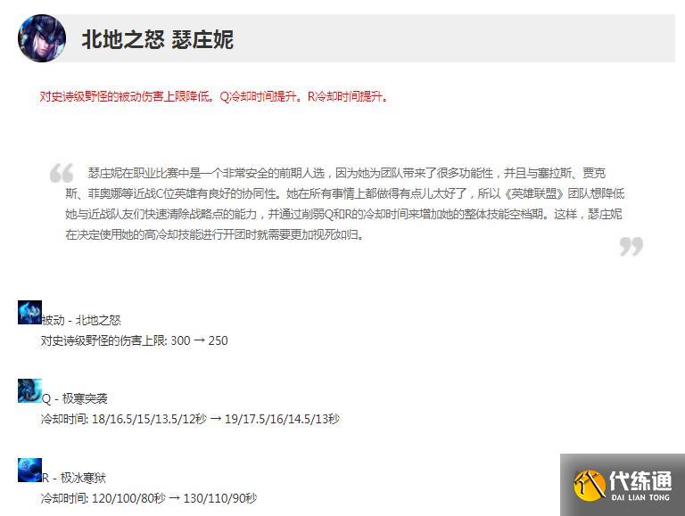 对史诗级野怪的被动伤害上限降低。Q冷却时间提升。R冷却时间提升。
