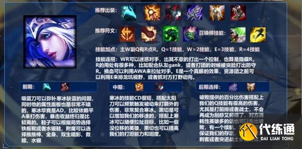 1、寒冰由于没有位移技能,所以她的容错率不高,生存环境恶劣,征服者加强寒冰的输出能力,
