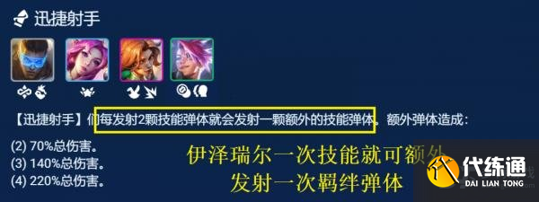 阵容给伊泽瑞尔搭配3超英与4迅射羁绊,通常阵容3-4枚棋子追三星,3超英就能给伊泽瑞尔增加额外27/30%额外伤害,可大幅度提升输出强度。而4迅射羁绊更是暴力,额外弹体伤害直接提升到220%,大家要知道伊泽瑞尔释放技能就可触发迅捷射手的额外弹体,直接让伊泽瑞尔的输出强度拉满。