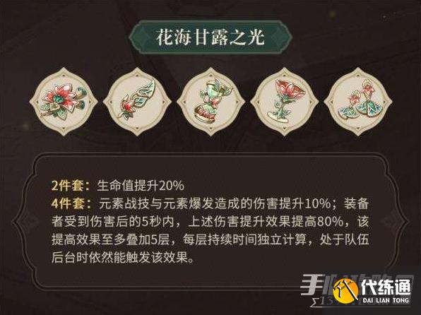 正如该套圣遗物的名字那样,【花海甘露之光】—— 又名花神套,2件套的生命值提升与套装的受伤叠加元素战技与元素爆发伤害的buff,恰好贴合妮露的角色特性,
