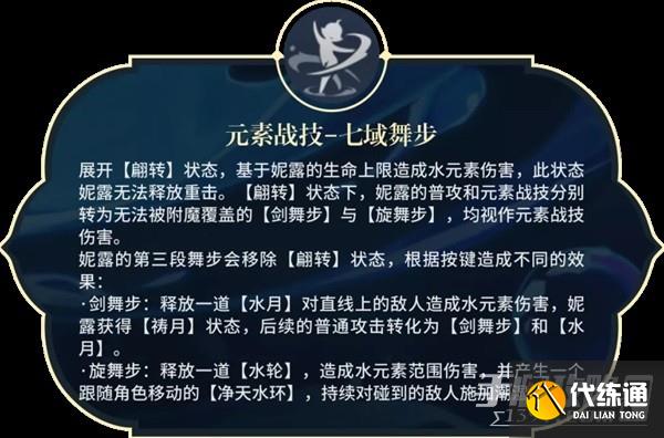 1、连按3次E,即完成释放【旋舞步】,产生一个水环(类似芭芭拉,但范围要大),每2秒进行一次弱水附着,水环无伤害。