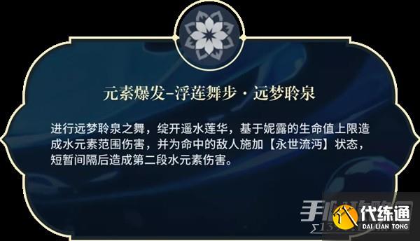 定位:妮露的主要作用是通过“净天水环”后台挂水辅助草/水系角色打绽放,并且这个“前台水系”包括妮露自己,所以,妮露是一个既可辅助自己也可辅助队友的绽放系辅助角色。