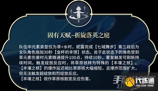 原绽放队伍核心天赋,在完成释放【剑舞步】与【旋舞步】后,获得「金杯的丰馈」,促使种子快速迸发,状态持续30S,并在收到草元素伤害时为全队提升100精通(白嫖,因为种子炸裂时,会对自身产生一定的伤害),精通提升持续10S。