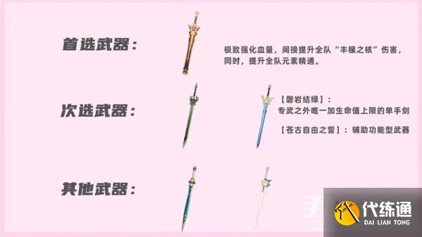 因此、综上可知道:除专武【圣显之钥】提升较大外,绿剑有点作用,但一般轮不到妮露,而其他武器则都差不多,另外,有非主流玩家喜欢打主C妮露的,可以选择三星神器【黎明神剑】。