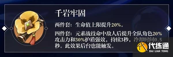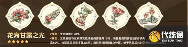 由上面的固定天的就可以知道,非满命的妮露,堆生命就完事,因此圣遗物首选2千岩+2花海,固定提升40%生命值。