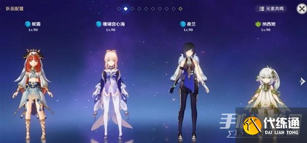 「妮露」最常用也是对群伤害最高的阵容组合,可应对绝大多数战斗环境。元素共鸣分别提高生命上限和精通,完美适配「妮露」绽放队的属性需求。